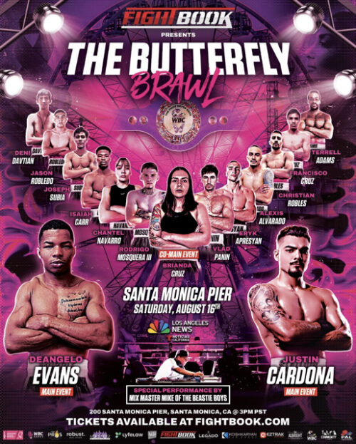Unbeaten boxer DeAngelo “Muscle” Evans will face off against Justin Cardona in the main event at this Saturday’s Butterfly Brawl to be held at the legendary Santa Monica Pier in Southern California. The two will go toe to toe for a special World Boxing Council (WBC) belt that will be awarded to the winner. The evening is a fundraiser benefiting the fight against cancer. This August 16 showdown is being promoted by Bash Boxing and presented by Fightbook.
